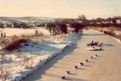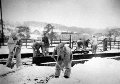 There are a few photographs showing the swing bridge. Figure 29 shows men clearing snow from the Mill side of the Swing Bridge. The rails on the canal bank appear to be at ground level right up to the canal edge and the bridge has supporting girders at the edge of the bridge deck to give rigidity. These RSJs were said to be about 2ft high.