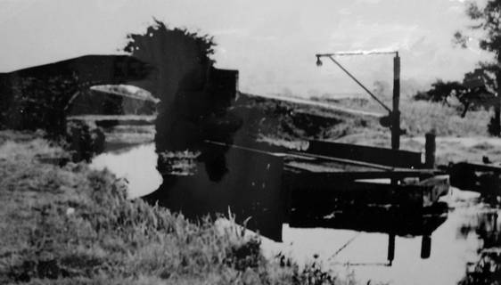 Figure 31 was taken from Canal Bridge 27 and shows the line of timbers to guide boats past the bridge, the rails and supporting girders at the edge of the bridge deck, but no details of any rotating mechanism. There is no evidence of any rail track parallel to the canal edge in the landing area or any crane.