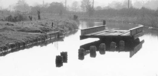 Figure 32 was obviously taken after Figure 30 as the bridge deck has disappeared, but the 7 timbers to guide boats past the bridge base remain. There is also no longer any sign of the hand rail on the far side of the landing area. It is reported that this picture was taken in 1982 . On the far side of the base of the swing bridge are the remains of more guide timbers, but again there is no evidence of any crane in the landing area.